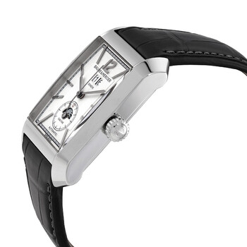 Stainless steel case with a black (alligator) leather strap. Fixed stainless steel bezel. Silver dial with silver-tone hands and index hour markers. An Arabic numeral appears below the 12 o'clock position. Minute markers around the outer rim. Dial Type: Analog. Date display below the 12 o'clock position. 12 hour (second time zone) sub-dial. Soprod caliber TT651 automatic movement, based upon ETA 2892-A2, containing 21 Jewels, bitting at 28800 vph, and has a power reserve of approximately 42 hours. Scratch resistant sapphire crystal. Pull / push crown. Transparent s case back. Rectangle case shape. Case dimensions: 48 mm x 31 mm. Case thickness: 11.1 mm. Triple fold over clasp. Water resistant at 50 meters / 165 feet. Functions: big date, GMT, second time zone, hour, minute, second. Hampton Series. Dress watch style. Watch label: Swiss Made. Baume et Mercier Hampton Automatic Silver Dial Men's Watch 10523.