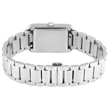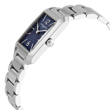 Stainless steel case with a stainless steel bracelet. Fixed stainless steel bezel. Blue dial with rhodium plated silver-tone hands and index hour markers. Arabic numerals appear at the 6 and 12 o'clock positions. Minute markers around the outer rim. Dial Type: Analog. Baume et Mercier calibre MHH057 quartz movement. Scratch resistant sapphire crystal. Pull / push crown. Solid case back. Rectangle case shape. Case dimensions: 35 mm x 22 mm. Case thickness: 6.92 mm. Hidden fold over clasp. Water resistant at 50 meters / 165 feet. Functions: hour, minute. Hampton Series. Dress watch style. Watch label: Swiss Made. Baume et Mercier Hampton Quartz Blue Dial Ladies Watch 10476.