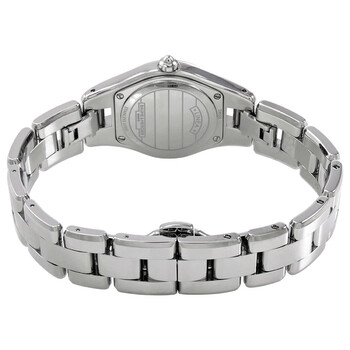 Stainless steel case with a stainless steel bracelet. Fixed stainless steel bezel showing Arabic numeral hour markers. White dial with silver-tone hands. No markers. Dial Type: Analog. Quartz movement. Scratch resistant sapphire crystal. Pull / push crown. Solid case back. Round case shape. Case size: 27 mm. Case thickness: 6.1 mm. Fold over clasp with a push button release. Water resistant at 50 meters / 165 feet. Functions: hour, minute, second. Linea Series. Dress watch style. Watch label: Swiss Made. Baume et Mercier LINEA Catwalk Qtz 27mm Watch 10196.