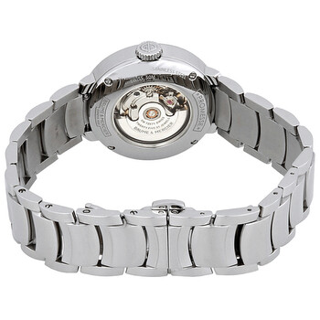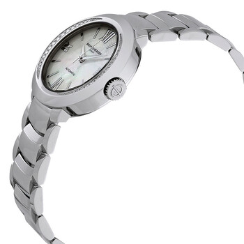 Stainless steel case with a stainless steel bracelet. Fixed stainless steel bezel set with diamonds. White mother of pearl dial with silver-tone dauphine-style shape hands and index hour markers. Roman numerals mark the 3, 6, 9 and 12 o'clock position. Dial Type: Analog. ETA caliber 2671 automatic movement with a 38-hour power reserve. Scratch resistant sapphire crystal. Pull / push crown. Transparent case back. Round case shape. Case size: 30 mm. Case thickness: 9.8 mm. Band width: 15 mm. Band length: 7 inches. Fold over clasp with a safety release. Water resistant at 50 meters / 165 feet. Functions: hour, minute. Luxury watch style. Watch label: Swiss Made. Item Variations: MOA10184, M0A10184, 10184. Baume et Mercier Promesse Mother of Pearl Dial Ladies Watch MOA10184.