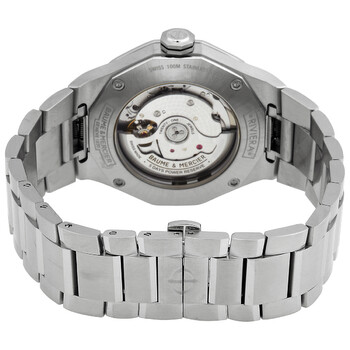 Stainless steel case with a stainless steel bracelet. Fixed stainless steel bezel. Transparent blue sapphire dial with luminous silver-tone hands and index hour markers. Roman numerals appear at the 6 and 12 o'clock positions. Dial Type: Analog. Luminescent hands and markers. Date display at the 3 o'clock position. Baumatic BM13-1975A automatic movement with a 120-hour power reserve. Scratch resistant sapphire crystal. Transparent case back. Dodecagon case shape, case size: 42 mm, case thickness: 10.7 mm. Deployment with push button release clasp. Water resistant at 100 meters / 330 feet. Functions: date, hour, minute, second. Additional Info: original box, manual (complete accessories). Riviera Series. Luxury watch style. Watch label: Swiss Made. Baume et Mercier Riviera Automatic Blue Dial Men's Watch M0A10616.