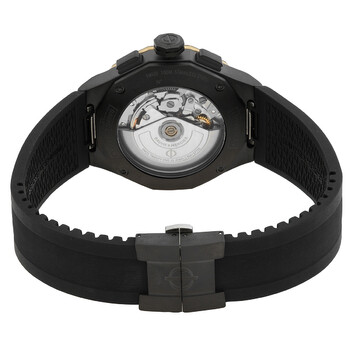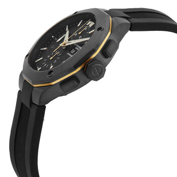 Black stainless steel case with a black rubber strap. Fixed black stainless steel bezel. Black dial with silver-tone hands and Arabic numeral & index hour markers. Minute markers around the outer rim. Dial Type: Analog. Luminescent hands and markers. Day of the week and date display at the 3 o'clock position. Chronograph - three sub-dials displaying: 60 second, 30 minute and 12 hour. ETA-Valjoux Caliber 7750 Automatic movement, containing 25 Jewels, bitting at 28800 vph, and has a power reserve of approximately 44 hours. Scratch resistant sapphire crystal. Dodecagon case shape, case size: 43 mm. Fold over clasp. Water resistant at 100 meters / 330 feet. Functions: chronograph, day, date, hour, minute, second. Riviera Series. Casual watch style. Watch label: Swiss Made. Baume et Mercier riviera Chronograph Automatic Black Dial Men's Watch 10625.