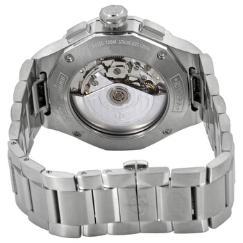Stainless steel case with a stainless steel bracelet. Fixed stainless steel bezel. Black dial with luminous silver-tone hands and index hour markers. Roman numeral appears atthe 12 o'clock position. Minute markers around the outer rim. Dial Type: Analog. Luminescent hands and markers. Day of the week and date display at the 3 o'clock position. Chronograph - three sub-dials displaying: 60 second, 30 minute and 12 hour. Automatic movement. Scratch resistant sapphire crystal. Screw down crown. Transparent case back. Dodecagon case shape. Case size: 43 mm. Case thickness: 14.1 mm. Fold over clasp. Water resistant at 100 meters / 330 feet. Functions: chronograph, day, date, hour, minute, second. Riviera Series. Sport watch style. Watch label: Swiss Made. Baume et Mercier Riviera Chronograph Automatic Black Dial Men's Watch M0A10624.