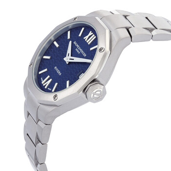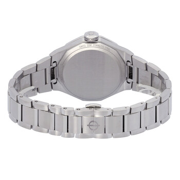 Silver-tone stainless steel case and bracelet. Fixed silver-tone stainless steel bezel. Blue dial with silver-tone hands and Roman & index hour markers. Dial Type: Analog. Luminescent hands and markers. Date display at the 3 o'clock position. Quartz movement. Scratch resistant sapphire crystal. Round case shape, case size: 33 mm. Fold over clasp with a safety release. Functions: date, hour, minute. Riviera Series. Casual watch style. Watch label: Swiss Made. Baume et Mercier Riviera Quartz Blue Dial Ladies Watch M0A10727.