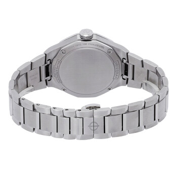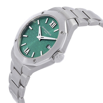 Stainless steel case with a stainless steel bracelet. Fixed stainless steel bezel. Green dial with luminous silver-tone hands and index hour markers. Roman numerals appear at the 6 and 12 o'clock positions. Dial Type: Analog. Luminescent hands. Date display at the 3 o'clock position. Quartz movement. Scratch resistant sapphire crystal. Screw down crown. Solid case back. Dodecagon case shape. Case size: 36 mm. Case thickness: 9.47 mm. Fold over clasp with a safety release. Water resistant at 50 meters / 165 feet. Functions: date, hour, minute. Riviera Series. Dress watch style. Watch label: Swiss Made. Baume et Mercier Riviera Quartz Green Dial Ladies Watch 10683.