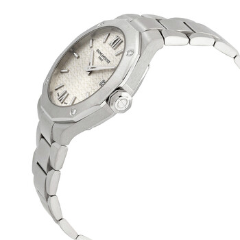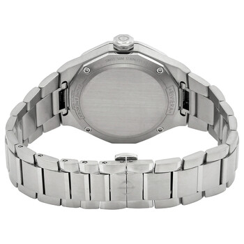 Stainless steel case with a stainless steel bracelet. Fixed stainless steel bezel. Silver-tone dial with luminous silver-tone hands and index hour markers. Roman numerals appear at the 6 and 12 o'clock positions. Dial Type: Analog. Luminescent hands and markers. Date display at the 3 o'clock position. Quartz movement. Scratch resistant sapphire crystal. Solid case back. Dodecagon case shape. Case size: 36 mm. Case thickness: 9.47 mm. Band width: 16 mm. Fold over clasp. Water resistant at 50 meters / 165 feet. Functions: date, hour, minute. Riviera Series. Sport watch style. Watch label: Swiss Made. Baume et Mercier Riviera Quartz Silver Dial Ladies Watch MOA10614.