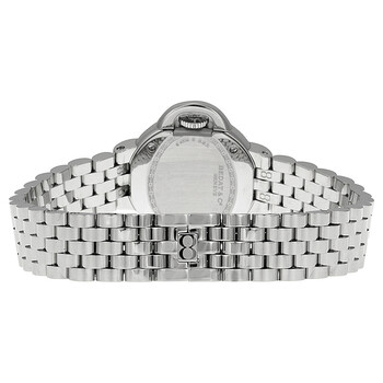 Stainless steel case with a stainless steel bracelet. Fixed silver-tone bezel set with diamonds. Silver dial with blue hands and Roman numeral hour markers. 'No 8' logo appears at the 8 o'clock position. Dial Type: Analog. Quartz movement. Scratch resistant sapphire crystal. Diamond-set protector crown. Solid case back. Case diameter: 26 mm. Case thickness: 8.5 mm. Round case shape. Hidden folding clasp. Water resistant at 50 meters / 165 feet. Functions: hour, minute. Luxury watch style. Watch label: Swiss A.O.S.C. Bedat No. 8 Silver Dial Stainless Steel Diamond Ladies Watch 827.041.600.