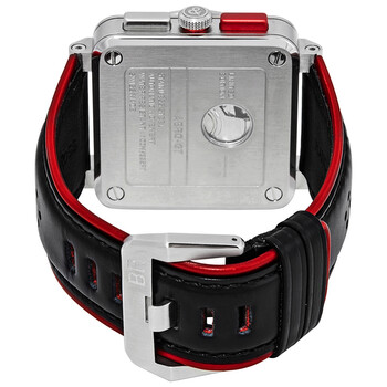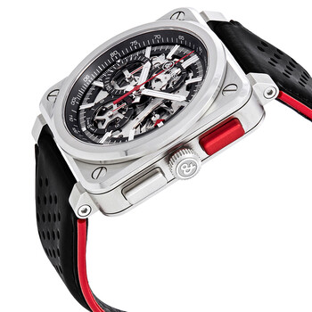 Silver-tone stainless steel case with a black (calfskin) leather (red rubber backed) strap. Fixed silver-tone stainless steel bezel. Skeleton dial with luminous silver-tone hands and index hour markers. Tachymeter scale around the outer rim. Dial Type: Analog. Luminescent hands and markers. Date display at the 3 o'clock position. Chronograph - three sub-dials displaying: 60 second, 30 minute and 12 hour. Bell and Ross Calibre BR-CAL.319 Automatic movement, based upon ETA 2894-2, containing 37 Jewels, bitting at 28800 vph. Scratch resistant sapphire crystal. Solid case back. Square case shape, case size: 42 mm. Tang clasp. Water resistant at 100 meters / 330 feet. Functions: chronograph, tachymeter, date, hour, minute, small second. Additional Info: ncludes additional ultra-resistant black synthetic fabric strap,. Aerogt Series. Luxury watch style. Watch label: Swiss Made. Bell and Ross AEROGT Chronograph Automatic Men's Watch BR03 94 AEROGT.