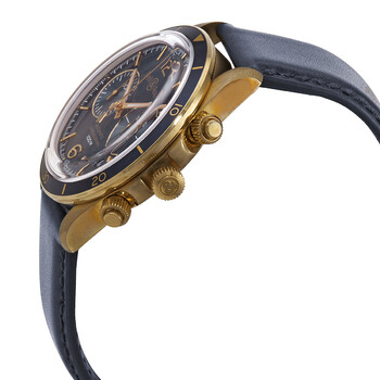 Bronze case with a blue (calfskin) leather strap. Bronze bezel with an inlaid blue anodised alumium ring. Blue dial with luminous bronze hands and index hour markers. Arabic numerals appear at the 6 and 12 o'clock positiuons. Minute markers around the outer rim. Dial Type: Analog. Luminescent hands and markers. Date display between the 4 and 5 o'clock positions. Chronograph - two sub-dials displaying: 60 second and 30 minute. Bell and Ross calibre BR-CAL.301 automatic movement, based upon ETA 2894-2, containing 37 Jewels, bitting at 28800 vph, and has a power reserve of approximately 42 hours. Scratch resistant sapphire crystal. Screw down crown. Transparent case back. Round case shape. Case size: 41 mm. Band width: 20 mm. Deployment clasp. Water resistant at 100 meters / 330 feet. Functions: chronograph, date, hour, minute, second. Additional Info: limited edition. Aeronavale Series. Luxury watch style. Watch label: Swiss Made. Bell and Ross Aeronavale Chronograph Automatic Blue Dial Men's Watch BRV294-BLU-BR/SCA.
