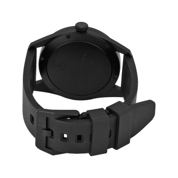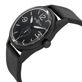 Black PVD stainless steel case with a black rubber strap. Fixed black PVD bezel. Black dial with luminous hands and index hour markers. Arabic numerals mark the 3, 9 and 12 o'clock positions. Minute markers around the outer rim. Dial Type: Analog. Date display at the 6 o'clock position. Small seconds sub-dial above the 6 o'clock position. Automatic movement with a 40-hour power reserve. Scratch resistant sapphire crystal. Screw down crown. Solid case back. Case diameter: 41 mm. Case thickness: 9.5 mm. Round case shape. Tang clasp. Water resistant at 100 meters / 330 feet. Functions: date, hour, minute, second. Luxury watch style. Watch label: Swiss Made. Bell and Ross Black Dial Rubber Automatic Men's Watch BRV123-BL-CA-SRB.