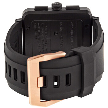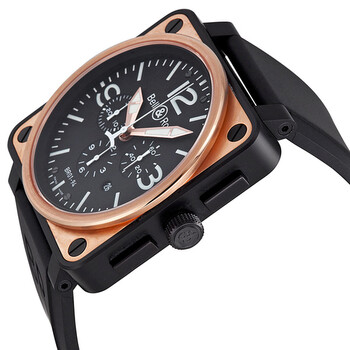 18 kt rose gold-plated stainless steel case with a black alligator leather strap. Fixed 18 kt rose gold bezel. Black dial with rose gold-tone hands and stick hour markers. Arabic numerals mark the 3, 9 and 12 o'clock positions. Minute markers around the outer rim. Dial Type: Analog. Luminescent hands and markers. Date display appears between the 4 and 5 o'clock positions. Chronograph - three sub-dials displaying: 60 second, 30 minute and 12 hour. Automatic movement. Scratch resistant sapphire crystal. Screw down crown. Solid case back. Case diameter: 46 mm. Square case shape. Tang clasp. Water resistant at 100 meters / 330 feet. Functions: chronograph, date, hour, minute, second. Luxury watch style. Watch label: Swiss Made. Bell and Ross Automatic Chronograph Rose Gold Men's Watch BR0194-BICOLOR.