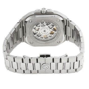 Silver-tone stainless steel case and bracelet. Fixed silver-tone stainless steel bezel. Black sunray dial with luminous silver-tone hands and index-Arabic numeral hour markers. Minute markers around the outer rim. Arabic numerals at 6,9 and 12 o' clock positions. Dial Type: Analog. Luminescent hands and markers. Date display at the 3 o'clock position. Calibre BR-CAL.325 automatic movement. Scratch resistant sapphire crystal. Screw down crown. Transparent see through case back. Square case shape, case size: 41 mm, case thickness: 11 mm. Fold over clasp. Water resistant at 100 meters / 330 feet. Functions: GMT, second time zone, hour, minute, second. Sport watch style. Watch label: Swiss Made. Bell and Ross Automatic GMT Black Dial Men's Watch BR05G-BL-ST/SST.
