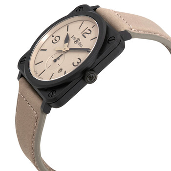 Matte black ceramic case with a beige leather strap. Fixed black ceramic bezel. Beige dial with black hands and index hour markers. Arabic numerals mark the 3, 9 and 12 o'clock positions. Dial Type: Analog. Date display between 4 and 5 o'clock position. One subdial displaying: small second. Bell and Ross Calibre BR-CAL.102 quartz movement. Scratch resistant sapphire crystal. Solid case back. Square case shape, case size: 39 mm, case thickness: 13 mm. Tang clasp. Water resistant at 100 meters / 330 feet. Functions: date, hour, minute, second. Aviation Desert Type Series. Luxury watch style. Watch label: Swiss Made. Bell and Ross Aviatio Desert Type Beige Dial Men's Watch BRS-DESERT-CEM.