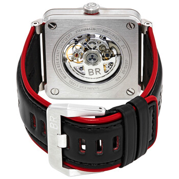 Silver-tone stainless steel case with a black calfskin leather strap. Fixed silver-tone stainless steel bezel. Skeleton dial with silver-tone hands and index hour markers. Minute scale around the inner rim. Dial Type: Analog. Luminescent hands and markers. Bell and Ross Calibre BR-CAL.318 automatic movement with a 38-hour power reserve. Scratch resistant sapphire crystal. Transparent case back. Square case shape. Case size: 42 mm. Tang clasp. Water resistant at 100 meters / 330 feet. Functions: hour, minute, second. Additional Info: limited edition of 500 pieces. Dress watch style. Watch label: Swiss Made. Bell and Ross Aviation Aero GT Automatic Men's Limited Edition Watch BR0392-SC/SCA.