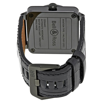 Black ceramic case with a black alligator leather strap. Fixed bezel. Black dial with luminous silver-tone hands and index hour markers. Arabic numerals mark the 3, 6, 9 and 12 o'clock positions. Minute markers around the outer rim. Dial Type: Analog. Luminescent hands and markers. Date display between the 4 and 5 o'clock positions. Automatic movement with a 42-hour power reserve. Scratch resistant sapphire crystal. Pull / push crown. Solid case back. Case size: 42 mm. Case thickness: 9.80 mm. Round case shape. Tang clasp. Water resistant at 100 meters / 330 feet. Functions: date, hour, minute, second. Luxury watch style. Watch label: Swiss Made. Bell and Ross Aviation Automatic Black Dial Men's Watch BR0392-CE-BLP-SCR.