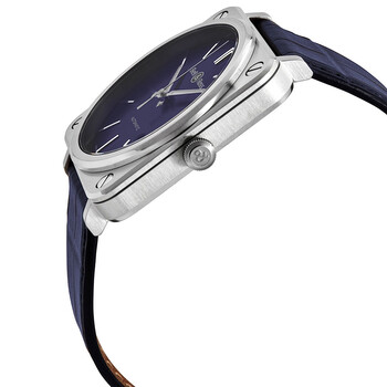 Stainless steel case with a blue (alligator) leather strap. Fixed stainless steel bezel. Blue dial with luminous silver-tone hands and index hour markers. Dial Type: Analog. Luminescent hands and markers. Date display between the 4 and 5 o'clock positions. Bell and Ross calibre BR-CAL.302 automatic movement, based upon Sellita SW300-1, containing 25 Jewels, bitting at 28800 vph, and has a power reserve of approximately 38 hours. Scratch resistant sapphire crystal. Pull / push crown. Transparent case back. Square case shape. Case size: 39 mm. Case thickness: 9 mm. Band length: 7 inches. Tang clasp. Water resistant at 100 meters / 330 feet. Functions: date, hour, minute, second. Aviation Series. Luxury watch style. Watch label: Swiss Made. Bell and Ross Aviation Automatic Blue Dial Men's Watch BRS92-BLU-ST/SCR.