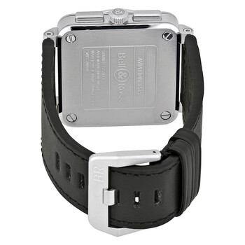 Stainless steel case with a black (calfskin) leather strap. Fixed stainless steel bezel. Black dial with luminous silver-tone hands and index hour markers. Arabic numerals mark the 6 and 12 o'clock positions. Minute markers. Tachymeter markers around the outer rim. Dial Type: Analog. Luminescent hands and markers. Date display between the 4 and 5 o'clock positions. Chronograph - two sub-dials displaying: 60 second and 30 minute. Bell and Ross calibre BR-CAL.301 automatic movement, based upon ETA 2894-2, containing 37 Jewels, bitting at 28800 vph, and has a power reserve of approximately 42 hours. Scratch resistant sapphire crystal. Pull / push crown. Solid case back. Square case shape. Case size: 42 mm. Case thickness: 12.6 mm. Band width: 24 mm. Tang clasp. Water resistant at 100 meters / 330 feet. Functions: chronograph, tachymeter, date, hour, minute, second. Aviation Series. Luxury watch style. Watch label: Swiss Made. Bell and Ross Aviation Automatic Chronograph Men's Watch BR0394-BLC-ST-SCA.