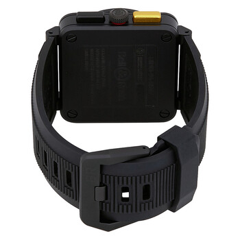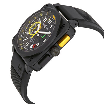 Black PVD stainless steel case with a black rubber strap. Black carbon fiber dial with silver-tone hands and Arabic numeral hour markers. Tachymeter. Dial Type: Analog. Luminescent hands and markers. Date display between 4 and 5 o'clock position. Chronograph - two sub-dials displaying: 60 second and 30 minute. Bell and Ross Calibre BR-CAL.301 automatic movement. Scratch resistant sapphire crystal. Solid case back. Case size: 42 mm. Square case shape. Water resistant at 100 meters / 330 feet. Functions: chronograph, date, hour, minute, second. Additional Info: limited edition of 500 pieces. Watch label: Swiss Made. Bell and Ross Aviation Black Carbon Fiber Dial Men's Limited Edition Watch BR0394-RS17.