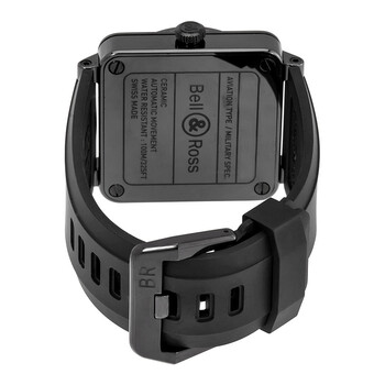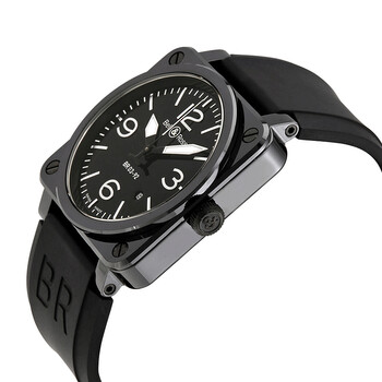 Black ceramic case with a black rubber strap. Fixed bezel. Black dial with silver-tone hands and index-Arabic numerals hour markers. Dial Type: Analog. Luminescent hands. Date display between 4 and 5 o'clock position. Automatic movement. Scratch resistant sapphire crystal. Case size: 42 mm. Square case shape. Tang clasp. Water resistant at 100 meters / 330 feet. Functions: date, hour, minute, second. Luxury watch style. Watch label: Swiss Made. Bell and Ross Aviation Black Dial Automatic Men's Watch BR0392-CER-BLP/SRB.