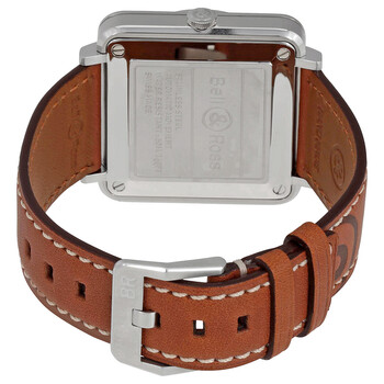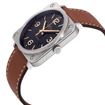 Silver-tone stainless steel case with a brown leather strap. Fixed bezel. Black sunray dial with rose gold-tone hands and index-Arabic numerals hour markers. Dial Type: Analog. Luminescent hands. Date display between 4 and 5 o'clock position. Automatic movement. Scratch resistant sapphire crystal. Solid case back. Case size: 39 mm. Square case shape. Water resistant at 50 meters / 165 feet. Functions: date, hour, minute, second. Dress watch style. Watch label: Swiss Made. Bell and Ross Aviation Black Sunray Dial Automatic Men's Watch BRS-GOLDEN-HER.