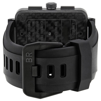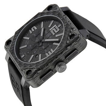 Black carbon fiber case with a black rubber strap. Fixed bezel. Black dial with black hands and stick hour markers. Arabic numerals mark the 3, 9 and 12 o'clock positions. Minute markers around the outer rim. Dial Type: Analog. Luminescent hands and markers. Date display between 4 and 5 o'clock positions. Chronograph - three sub-dials displaying: 60 second, 30 minute and 12 hour. Automatic movement. Scratch resistant sapphire crystal. Solid case back. Case diameter: 46 mm. Square case shape. Tang clasp. Water resistant at 100 meters / 330 feet. Functions: chronograph, date, hour, minute, second. Luxury watch style. Watch label: Swiss Made. Bell and Ross Aviation Chronograph Automatic Carbon Fiber Men's Watch BR0194-CA-FIBER-PH.