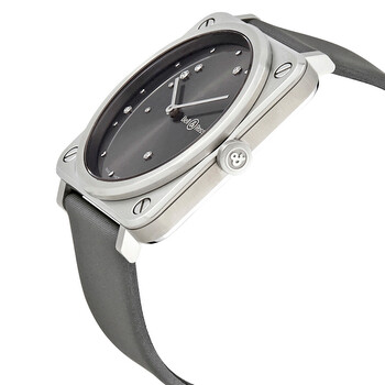 Stainless steel case with a grey satin (calfskin) strap. Fixed stainless steel bezel. Grey sunray (diamond-set) dial with silver-tone hands and dot hour markers. Dial Type: Analog. Small second subdial. Bell and Ross calibre BR-CAL.102 quartz movement. Scratch resistant sapphire crystal. Pull / push crown. Solid case back. Square case shape. Case size: 39 mm. Tang clasp. Water resistant at 100 meters / 330 feet. Functions: hour, minute. Casual watch style. Watch label: Swiss Made. Bell and Ross Aviation Grey Sunray Diamond Dial Watch BRS-ERU-ST/SCA.