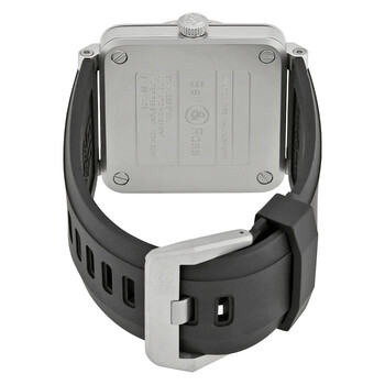 Silver-tone microblasted steel case with a black rubber strap. Fixed silver-tone microblasted steel bezel. Grey dial with luminous grey sword-shaped hands and index hour markers. Arabic numerals mark the 3, 6, 9 and 12 o'clock position. Dial Type: Analog. Luminescent hands and markers. Date display between the 4 and 5 o'clock positions. Bell and Ross calibre BR-CAL.302 automatic movement, based upon Sellita SW300-1, containing 25 Jewels, bitting at 28800 vph, and has a power reserve of approximately 38 hours. Scratch resistant sapphire crystal. Pull / push crown. Solid case back. Square case shape. Case size: 42 mm. Case thickness: 9.8 mm. Tang clasp. Water resistant at 100 meters / 330 feet. Functions: date, hour, minute, second. Additional Info: additional ultra-resilient synthetic fabric. limited edition of 999 pieces. Aviation Horoblack Series. Luxury watch style. Watch label: Swiss Made. Bell and Ross Aviation Horoblack Automatic Men's Limited Edition Watch BR0392-GBL-ST/SRB.