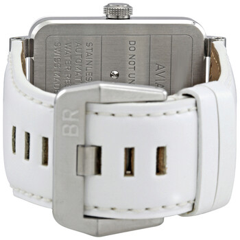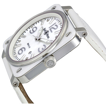 White ceramic case with a white (calfskin) leather strap. Fixed bezel. White mother of pearl dial with silver-tone hands and index hour markers. Arabic numerals mark the 3, 6, 9 and 12 o'clock position. Dial Type: Analog. Luminescent hands and markers. Date display appears between the 4 and 5 o'clock position. Automatic movement. Scratch resistant sapphire crystal. Solid case back. Case diameter: 42 mm. Square case shape. Tang clasp. Water resistant at 100 meters/ 330 feet. Functions: date, hour, minute, second. Luxury watch style. Watch label: Swiss Made. Bell and Ross Aviation Mother of Pearl White Ceramic Men's Watch BR0392-WHT-CER.