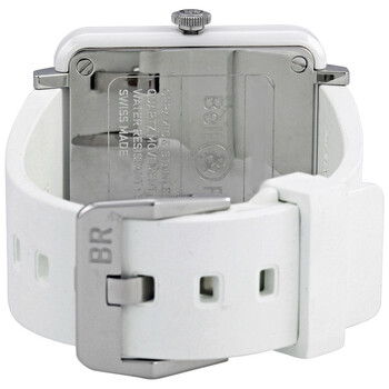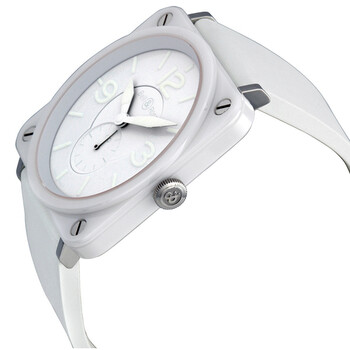 White ceramic case with a white rubber strap. Fixed white ceramic bezel. White dial with luminous hands and index hour markers. Arabic numerals mark the 3, 9 and 12 o'clock positions. Dial Type: Analog. Luminescent hands. Small seconds sub-dial above the 6 o'clock position subdials. Quartz movement. Scratch resistant sapphire crystal. Solid case back. Case size: 39 mm. Square case shape. Water resistant at 50 meters / 165 feet. Functions: hours, minutes, seconds. Luxury watch style. Watch label: Swiss Made. Item Variations: BRS WHC PH SRB, BRS.WHC.PH.SRB, BRSWHCPHSRB. Bell and Ross Aviation White Phantom White Rubber Unisex Watch BRSWHCPHSRB.