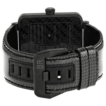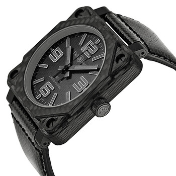 Matte black PVD (physical vapor deposition) 'carbon' stainless steel case with a carbon fiber rubber strap. Fixed carbon fiber bezel. Black Clous de Paris dial with black hands and index hour markers. Arabic numerals mark the 3, 6, 9 and 12 o'clock positions. Minute markers around the outer rim. Dial Type: Analog. Luminescent hands and markers. Automatic movement. Scratch resistant sapphire crystal. Screw in crown. Solid case back. Case diameter: 46 mm. Square case shape. Tang clasp. Water resistant at 100 meters / 330 feet. Functions: hour, minute, second. Luxury watch style. Watch label: Swiss Made. Bell and Ross Aviavtion Carbon Fiber Phantom Black Dial Automatic Men's Watch BR0192-CA-FIBER-PH.