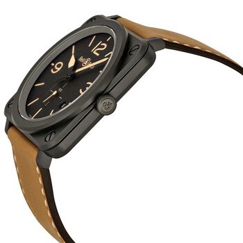 Black ceramic case with a beige (calfskin) leather strap. Fixed black ceramic bezel. Black dial with sand hands and index hour markers. Arabic numerals mark the 3, 9 and 12 o'clock positions. Dial Type: Analog. Luminescent hands and markers. Date display between the 4 and 5 o'clock positions. Seconds sub-dial above the 6 o'clock position. Quartz movement. Scratch resistant sapphire crystal. Pull / push crown. Solid case back. Case diameter: 39 mm. Case thickness: 13 mm. Square case shape. Band width: 25 mm. Tang clasp. Water resistant at 100 meters / 330 feet. Functions: date, hour, minute, second. Luxury watch style. Watch label: Swiss Made. Bell and Ross Black Dial Beige Calfskin Leather Men's Watch BLRBRS-HERI-CEM.