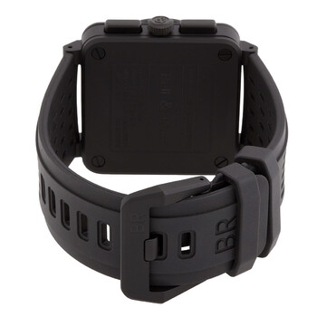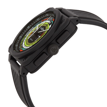 Black ceramic case with a black rubber strap. Fixed black ceramic bezel. Black dial with white hands. Arabic numeral minute markers (at 5 minute intervals). Dial Type: Analog. Date display at the 1 o'clock position. Chronograph - two sub-dials displaying: 60 second and 30 minute. Bell and Ross Calibre BR-CAL.301 Automatic movement, based upon ETA 2894-2, containing 37 Jewels, bitting at 28800 vph, and has a power reserve of approximately 42 hours. Scratch resistant sapphire crystal. Square case shape, case size: 42 mm, case thickness: 12.8 mm. Tang clasp. Water resistant at 100 meters / 330 feet. Functions: chronograph, date, hour, minute, small second. Br 03-94 Multimeter Series. Luxury watch style. Watch label: Swiss Made. Bell and Ross BR 03-94 Multimeter Chronograph Automatic Black Dial Men's Watch BR0394-SW-CE/SRB.