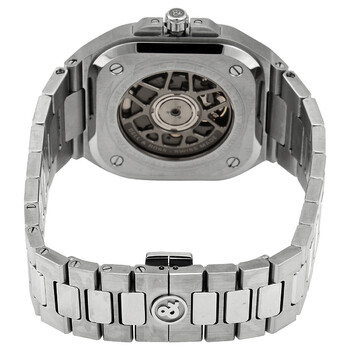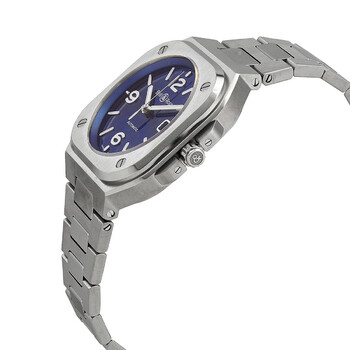 Stainless steel case with a stainless steel bracelet. Fixed stainless steel bezel. Blue dial with luminous silver-tone hands and index hour markers. Arabic numerals mark the 6, 9 and 12 o'clock positions. Dial Type: Analog. Luminescent hands and markers. Date display at the 3 o'clock position. Bell and Ross calibre 321 automatic movement. Scratch resistant sapphire crystal. Screw down crown. Transparent case back. Square case shape. Case size: 40 mm. Case thickness: 10.4 mm. Fold over clasp with a push button release. Water resistant at 100 meters / 330 feet. Functions: date, hour, minute, second. Br 05 Blue Steel Series. Luxury watch style. Watch label: Swiss Made. Bell and Ross BR 05 Blue Steel Automatic Blue Dial Men's Watch BR05A-BLU-ST/SST.