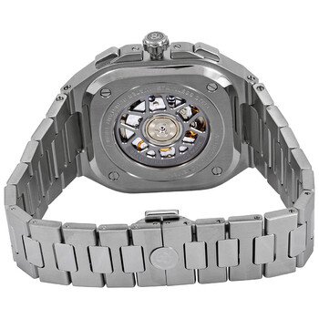 Silver-tone stainless steel case and bracelet. Fixed silver-tone stainless steel bezel. Blue dial with silver-tone hands and index-Arabic numeral hour markers. Arabic numeral marker appears at the 6 and 12 o'clock positions. Arabic numeral minute markers (at 5 minute intervals). Dial Type: Analog. Luminescent hands and markers. Date display between 4 and 5 o'clock position. Chronograph - two sub-dials displaying: 60 second and 30 minute. Bell and Ross Calibre BR-CAL.301 Automatic movement, based upon ETA 2894-2, containing 37 Jewels, bitting at 28800 vph, and has a power reserve of approximately 42 hours. Scratch resistant sapphire crystal. Screw down crown. Transparent case back. Square case shape, case size: 42 mm. Folding clasp. Water resistant at 100 meters / 330 feet. Functions: chronograph, date, hour, minute, second. Br 05 Chrono Series. Luxury watch style. Watch label: Swiss Made. Bell and Ross Br 05 Chrono Chronograph Automatic Blue Dial Men's Watch BR05C-BLU-ST/SST.