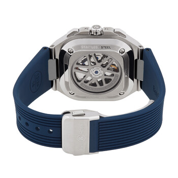 Silver-tone stainless steel case with a blue rubber strap. Fixed silver-tone stainless steel bezel. Blue dial with silver-tone hands and index-Arabic numeral hour markers. Arabic numeral marker appears at the 6 and 12 o'clock positions. Minute markers around the outer rim. Dial Type: Analog. Luminescent hands and markers. Date display between 4 and 5 o'clock position. Chronograph - two sub-dials displaying: 60 second and 30 minute. Automatic movement. Scratch resistant sapphire crystal. Transparent case back. Square case shape, case size: 42 mm. Folding clasp. Water resistant at 100 meters / 330 feet. Functions: chronograph, date, hour, minute, second. Br 05 Series. Sport watch style. Watch label: Swiss Made. Bell and Ross BR 05 Chronograph Automatic Blue Dial Men's Watch BR05C-BLU-ST/SRB.