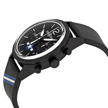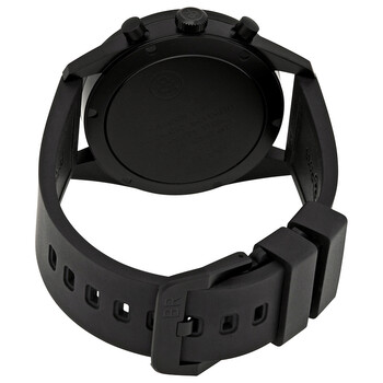 Black PVD stainless steel case with a black rubber strap. Fixed black PVD stainless steel bezel. Black dial with luminous black sword-shaped hands and index hour markers. Arabic numeral appears at the 12 o'clock position. minute markers around the outer rim. Dial Type: Analog. Luminescent hands and markers. Date display between the 4 and 5 o'clock positions. Chronograph - two sub-dials displaying: 60 second and 30 minute. Bell and Ross Calibre BR-CAL.301 Automatic movement, based upon ETA 2894-2, containing 37 Jewels, bitting at 28800 vph, and has a power reserve of approximately 42 hours. Scratch resistant sapphire crystal. Solid case back. Round case shape, case size: 41 mm, case thickness: 14.2 mm. Band width: 22 mm. Tang clasp. Water resistant at 100 meters / 330 feet. Functions: chronograph, date, hour, minute, small second. Additional Info: limited edition of 99 pieces. Br 126 Insignia Us Series. Sport watch style. Watch label: Swiss Made. Bell and Ross BR 126 Insignia US Chronograph Automatic Black Dial Men's Watch BRV126-BL-CA-CO/US.