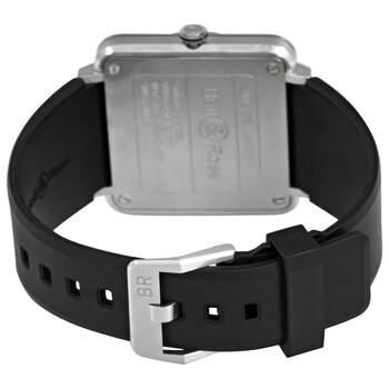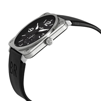 Stainless steel case with a black rubber strap. Fixed stainless steel bezel. Black dial with luminous silver-tone hands and index hour markers. Arabic numerals mark the 3, 9 and 12 o'clock positions. Dial Type: Analog. Small seconds sub-dial. Bell and Ross calibre BR-CAL.102 quartz movement. Scratch resistant sapphire crystal. Solid case back. Square case shape. Case size: 39 mm. Tang clasp. Water resistant at 100 meters / 330 feet. Functions: date, minute, small second, chronometer. Brs Series. Luxury watch style. Watch label: Swiss Made. Item Variations: BRS STEEL, BRS.STEEL, BRSSTEEL. Bell and Ross BRS Quartz Chronometer Black Dial Ladies Watch BRS-STEEL.