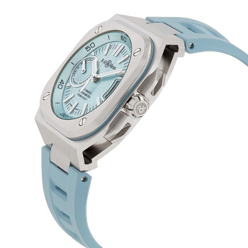 Silver-tone stainless steel case with a blue rubber strap. Fixed silver-tone stainless steel bezel. Blue dial with silver-tone hands and index hour markers. Minute markers around the outer rim. Dial Type: Analog. Luminescent hands and markers. Date display at the 3 o'clock position. Bell and Ross Calibre 323 automatic movement with a 70-hour power reserve. Scratch resistant sapphire crystal. Screw down crown. Transparent see through case back. Square case shape, case size: 41 mm. Fold over clasp with a safety release. Water resistant at 100 meters / 330 feet. Functions: date, hour, minute, second, power reserve. Additional Info: original box, international warranty card, manual (complete accessories). Br-x5 Series. Luxury watch style. Watch label: Swiss Made. Bell and Ross BR-X5 Automatic Blue Dial Men's Watch BRX5RIBSTSRB.