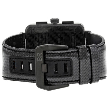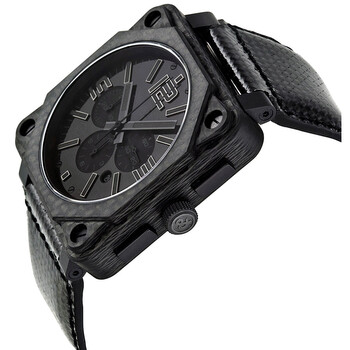 Carbon fiber case with a black carbon fiber and rubber strap. Fixed bezel. Black Clous de Paris design dial with black hands and stick hour markers. Arabic numerals mark the 3, 9 and 12 o'clock positions. Minute markers around the outer rim. Dial Type: Analog. Luminescent hands and markers. Date display appears between the 4 and 5 o'clock positions. Chronograph - three sub-dials displaying: 60 second, 30 minute and 12 hour. Automatic movement. Scratch resistant sapphire crystal. Screw down crown. Case diameter: 46 mm. Square case shape. Tang clasp. Water resistant at 100 meters / 330 feet. Functions: chronograph, date, hour, minute, second. Luxury watch style. Watch label: Swiss Made.