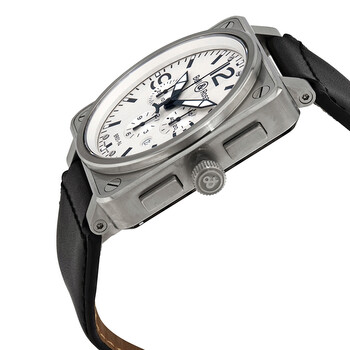 Stainless steel case with a black rubber strap. Fixed stainless steel bezel. White dial with luminous black hands and index hour markers. Arabic numerals mark the 3, 9 and 12 o'clock poisitions. Minute markers around the outer rim. Dial Type: Analog. Luminescent hands and markers. Date display between the 4 and 5 o'clock positions. Chronograph - three sub-dials displaying: 60 second, 30 minute and 12 hour. ETA 2894 automatic movement with a 42-hour power reserve. Scratch resistant sapphire crystal. Screw down crown. Solid case back. Square case shape. Case size: 46 mm. Tang clasp. Water resistant at 100 meters / 330 feet. Functions: chronograph, date, hour, minute, second. Luxury watch style. Watch label: Swiss Made. Item Variations: BR0194 WHT ST, BR0194.WHT.ST, BR0194WHTST. Bell and Ross Chronograph Automatic White Dial Men's Watch BR0194-WHT-ST.