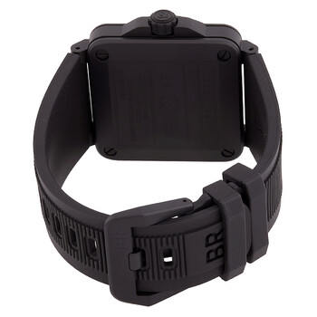Black ceramic case with a black rubber strap. Uni-directional rotating black ceramic bezel. Blue dial with black hands and index hour markers. Minute markers around the outer rim. Dial Type: Analog. Luminescent hands and markers. Date display between 4 and 5 o'clock position. Bell and Ross Calibre BR-CAL.302 Automatic movement, based upon Sellita SW300-1, containing 25 Jewels, bitting at 28800 vph, and has a power reserve of approximately 38 hours. Scratch resistant sapphire crystal. Screw down crown. Solid case back. Round case shape, case size: 42 mm. Buckle clasp. Water resistant at 300 meters / 1000 feet. Functions: date, hour, minute, second. Diver Series. Dive watch style. Watch label: Swiss Made. Bell and Ross Diver Automatic Blue Dial Men's Watch BR03A-D-LM-CE/SRB.