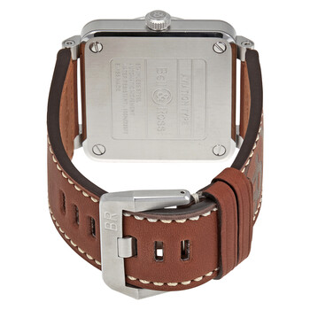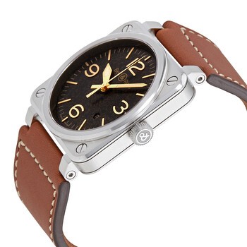 Stainless steel case with a tan (calfskin) leather strap. Fixed stainless steel bezel. Black dial with luminous gold-tone hands and index hour markers. Arabic numerals appear at the 3, 6, 9 and 12 o'clock positions. Minute markers around the outer rim. Dial Type: Analog. Date display between the 4 and 5 o'clock positions. Bell and Ross calibre BR-CAL.302 automatic movement, based upon Sellita SW300-1, containing 25 Jewels, bitting at 28800 vph, and has a power reserve of approximately 38 hours. Scratch resistant sapphire crystal. Solid case back. Square case shape. Case size: 42 mm. Case thickness: 9.8 mm. Band width: 20 mm. Tang clasp. Water resistant at 100 meters / 330 feet. Functions: date, hour, minute, second. Aviation Series. Luxury watch style. Watch label: Swiss Made. Bell and Ross Golden Heritage Automatic Black Dial Men's Watch BR0392-ST-G-HE