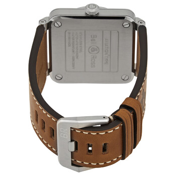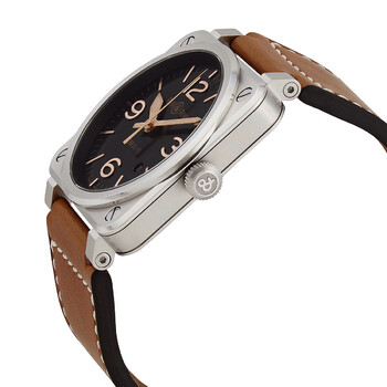 Stainless steel case with a brown (calfskin) leather strap. Fixed stainless steel bezel. Black sunray dial with luminous rose gold-tone hands and index hour markers. Arabic numerals appear at the 3, 6, 9 and 12 o'clock positions. Minute markers around the outer rim. Dial Type: Analog. Luminescent hands. Date display between the 4 and 5 o'clock positions. Bell and Ross calibre BR-CAL.302 Automatic movement, based upon Sellita SW300-1, containing 25 Jewels, bitting at 28800 vph, and has a power reserve of approximately 38 hours. Scratch resistant sapphire crystal. Screw down crown. Solid case back. Square case shape. Case size: 42 mm. Case thickness: 9.8 mm. Tang clasp. Water resistant at 100 meters / 330 feet. Functions: date, hour, minute, second. Heritage Series. Luxury watch style. Watch label: Swiss Made. Bell and Ross Heritage Automatic Men's Watch BR0392-GH-ST/SCA.