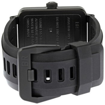 Black Ion-plated stainless steel case with a black rubber strap. Fixed black ion-plated bezel. Black dial with luminous blue hands and blue index hour markers. Blue Arabic numerals mark the 3, 6, 9, and 12 o'clock positions. Minute markers around the outer rim. Date display appears between the 4 and 5 o'clock positions. Automatic movement. Scratch resistant sapphire crystal. Solid case back. Case dimensions: 42 mm x 42 mm. Tang clasp. Water resistant at 100 meters/ 330 feet. Functions: hours, minutes, seconds, calendar. Bell and Ross Instrument Black and Blue Dial Automatic 42MM Men's Watch BR-03-92-BLUE.