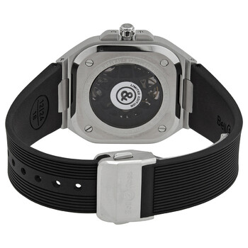 Stainless steel case with a black rubber strap. Fixed stainless steel bezel. Skeleton dial with black hands and index hour markers. Dial Type: Analog. Luminescent hands and markers. Bell and Ross calibre BR-CAL.322 automatic movement, based upon Sellita SW300-1, containing 25 Jewels, bitting at 28800 vph, and has a power reserve of approximately 38 hours. Scratch resistant sapphire crystal. Screw down crown. Transparent case back. Square case shape. Case size: 40 mm. Fold over clasp. Water resistant at 100 meters / 330 feet. Functions: hour, minute, second. Additional Info: limited edition of 500 pieces. Instruments Series. Luxury watch style. Watch label: Swiss Made. Bell and Ross Instruments Automatic Skeleton Dial Men's Watch BR05A-BL-SK-ST/SRB.