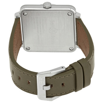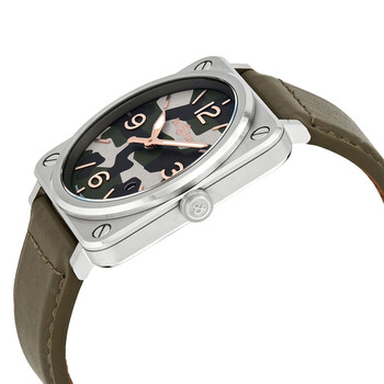 Stainless steel case with a khaki green (calfskin) leather strap. Fixed stainless steel bezel. Khaki camouflage dial with luminous rose gold-tone hands and index hour markers. Arabic numerals mark the 3, 6, 9 and 12 o'clock positions. Dial Type: Analog. Luminescent hands. Date display between the 4 and 5 o'clock positions. Bell and Ross calibre BR-CAL.102 quartz movement. Scratch resistant sapphire crystal. Pull / push crown. Solid case back. Square case shape. Case dimensions: 39 mm x 39 mm. Tang clasp. Water resistant at 100 meters / 330 feet. Functions: date, hour, minute, second. Military watch style. Watch label: Swiss Made. Bell and Ross Khaki Camouflage Dial Men's Watch BRS-CK-ST/SCA.