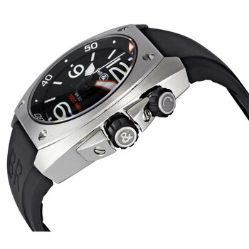 Stainless steel case with a black rubber strap. Fixed stainless steel bezel. Black dial with luminous hands and index hour markers. Arabic numerals mark the 3, 6, 9 and 12 o'clock positions. Minute markers around the outer rim. Dial Type: Analog. Luminescent hands and markers. Date display appears between the 4 and 5 o'clock positions. Automatic movement. Scratch resistant sapphire crystal. Screw down crown. Solid case back. Case diameter: 44 mm. Case thickness: 17 mm. Tonneau case shape. Band width: 28 mm. Band length: 8.5 inches. Tang clasp. Water resistant at 1000 meters/ 3300 feet. Functions: date, hour, minute, second. Luxury watch style. Watch label: Swiss Made. Bell and Ross Marine Black Dial Steel Case Men's Watch BR0292-STEEL.