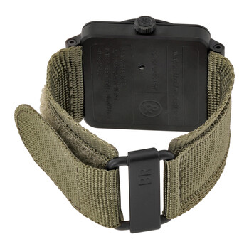 Black PVD stainless steel case with a green nylon strap. Fixed black PVD stainless steel bezel. Khaki dial with white hands and index hour markers. Arabic numerals mark the 3, 6, 9 and 12 o'clock positions. Minute markers around the outer rim. Dial Type: Analog. Date display between the 4 and 5 o'clock positions. Automatic movement. Scratch resistant sapphire crystal. Solid case back. Case size: 42 mm. Square case shape. Slip through clasp. Water resistant at 100 meters / 330 feet. Functions: date, hour, minute, second. Luxury watch style. Watch label: Swiss Made. Bell and Ross Military Type GI Joe Edition Men's Watch BR03-92-S.