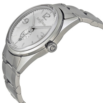 Silver-tone stainless steel case with a silver-tone stainless steel bracelet. Fixed silver-tone stainless steel bezel. Silver dial with silver-tone hands and stick hour markers. Arabic numerals mark the 3, 9 and 12 o'clock positions. minute markers around the outer rim. Dial Type: Analog. Luminescent hands and markers. Date display at the 6 o'clock position. Small seconds sub-dial at the 6 o'clock position subdials. Bell and Ross Calibre BR-CAL.305 Automatic movement, based upon ETA 2895-2, containing 27 Jewels, bitting at 28800 vph, and has a power reserve of approximately 42 hours. Scratch resistant sapphire crystal. Skeleton case back. Round case shape, case size: 41 mm. Fold over with safety release clasp. Water resistant at 100 meters / 330 feet. Functions: date, hour, minute, second. Officer Series. Luxury watch style. Watch label: Swiss Made. Bell and Ross Officer Automatic Silver Dial Stainless Steel Men's Watch BR123-WH-ST-SS.