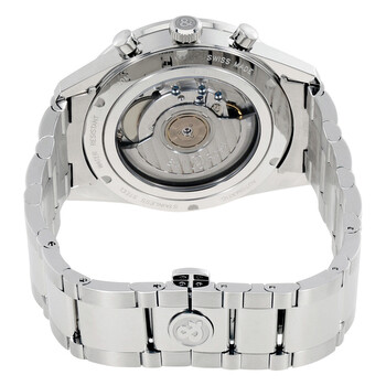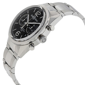 Stainless steel case with a stainless steel bracelet. Fixed stainless steel bezel. Black dial with silver-tone hands and index hour markers. Arabic numerals mark the 6 and 12 o'clock positions. minute markers around the outer rim. Dial Type: Analog. Luminescent hands and markers. Date display between 4 and 5 o'clock positions. Chronograph - two sub-dials displaying: 60 second and 30 minute. ETA 2894 automatic movement with about 40 hours of power reserve. Scratch resistant sapphire crystal. Screw down crown. Skeleton case back. Case size: 41 mm. Round case shape. Push button clasp. Water resistant at 100 meters / 330 feet. Functions: chronograph, date, hour, minute, second. Luxury watch style. Watch label: Swiss Made. Item Variations: BR126 OFFICER SSB, BR126.OFFICER.SSB, BR126OFFICERSSB. Bell and Ross Officer Chronograph Black Dial Men's Watch BR126-OFFICER-SSB.